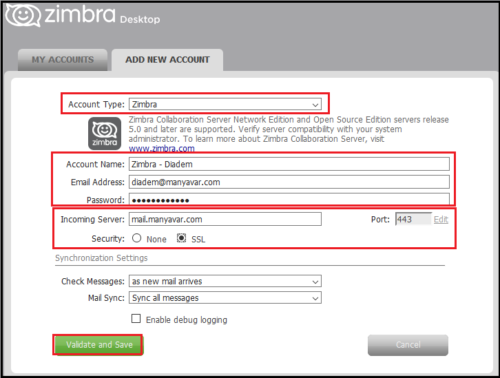 10. When you are finished, click Validate and Save (Zimbra desktop validates your account information. If your account is successfully validated, you see the Service Created dialog. If your account is not successfully validated, you are returned to the Account Setup dialog so you can review and make corrections).